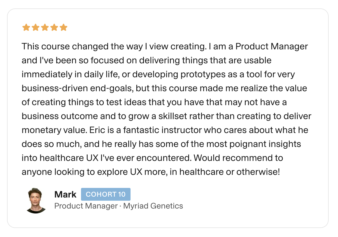 Student course reviews from the last ten cohorts of Healthcare UX Certification on Maven.